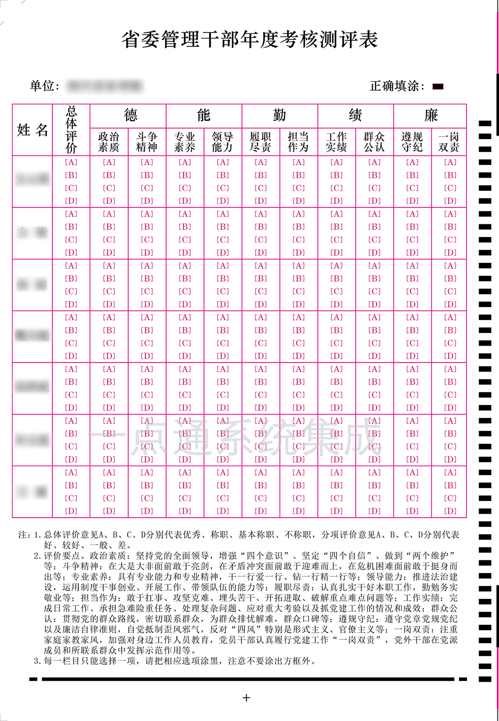 系統充分運用了現代化信息技術成果,通過考核人員填涂測評卡,利用光標閱讀機(OMR)高速錄入,使數據采集工作變得簡便快捷,現場可完成上萬張測評卡的錄入、分析及處理工作,比手工操作速度快數百倍,且數據準確無誤,并可反復統計、校驗。系統本著客觀公正、民主公開、注重實績的原則,為客觀準確地評價被評人的工作質量、工作成果提供了重要依據。通過量化考核測評,不僅建立了科學的指標體系、量化考核測評制度,而且也為健全和完善干部考核機制奠定了堅實的基礎。